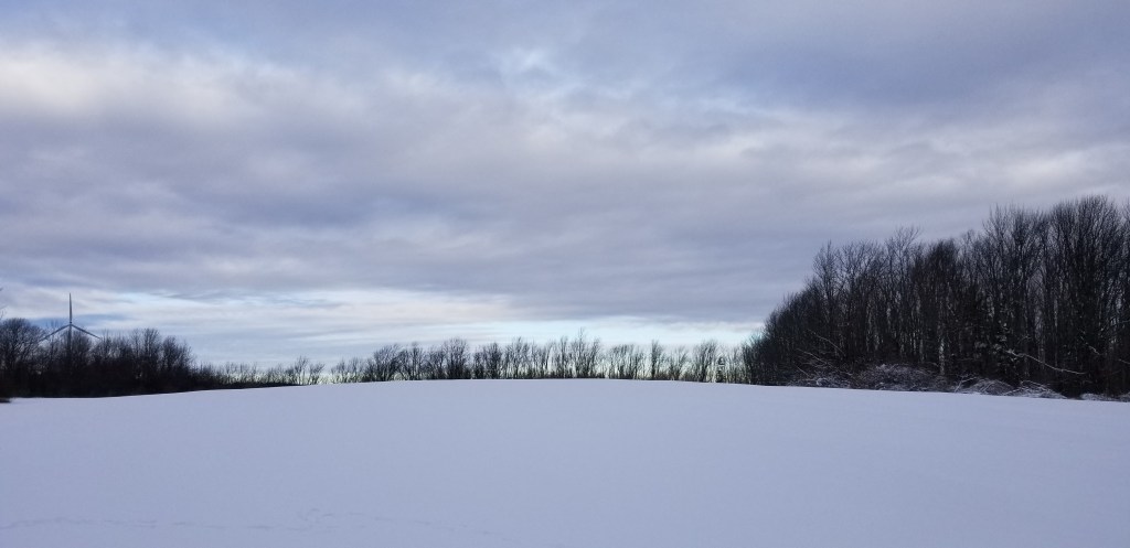 Empty space is both beautiful and terrible. Empty space is room for wonder. An empty spot is a place to land. Its also where someone once was. I am lucky to have this beautiful empty field to romp in with my dogs. The magic is that it is both vacant and so full. It can be lonely, I can be alone. It is peacefully quiet – all I can hear is the cardinals and robins singing in the old crab apple tree. The ground is so free of markings that I can make patterns with my tracks. There is no trail until the dogs break though the snow and offer me a path.